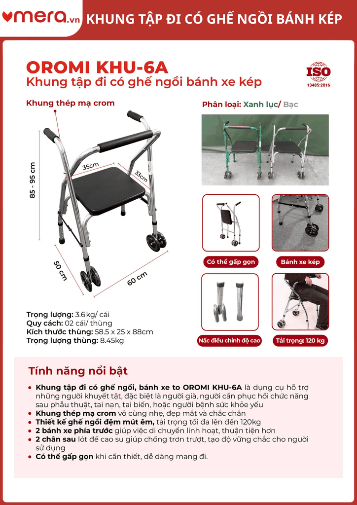 Khung Tập Đi OROMI KHU-6A: Khung thép mạ crom, tích hợp ghế ngồi đệm mút êm ái. Bánh xe kép linh hoạt, chịu tải 120kg. Hỗ trợ người già, người khuyết tật phục hồi chức năng.