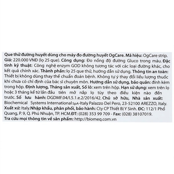 Que thử đường huyết Ogcare được sản xuất bởi Biochemical Systems International.