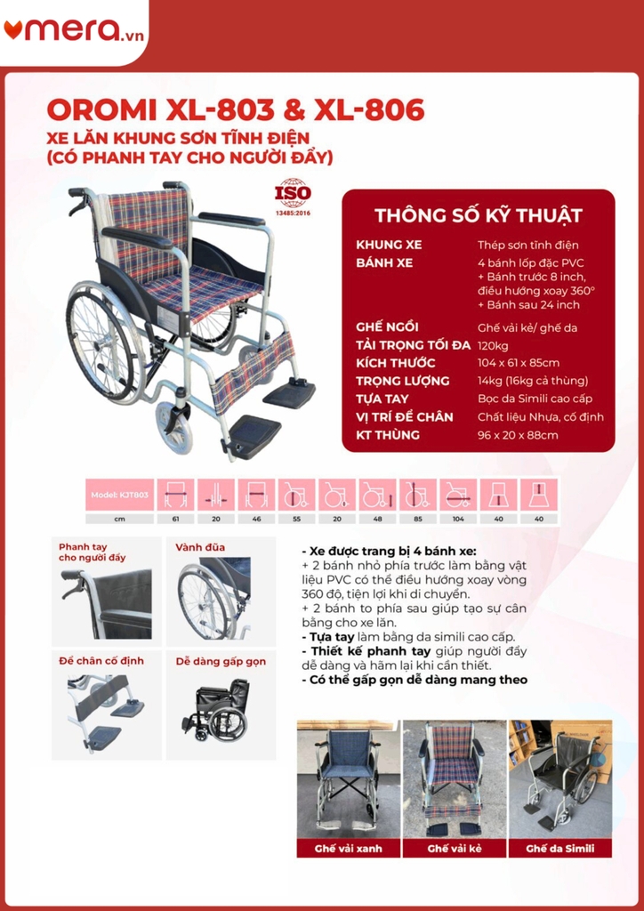 Xe Lăn OROMI XL-803: Khung thép sơn tĩnh điện bền, nhẹ, tải trọng 120kg. Có phanh tay cho người đẩy. Ghế vải kẻ, dễ dàng gấp gọn, tiện lợi khi di chuyển.